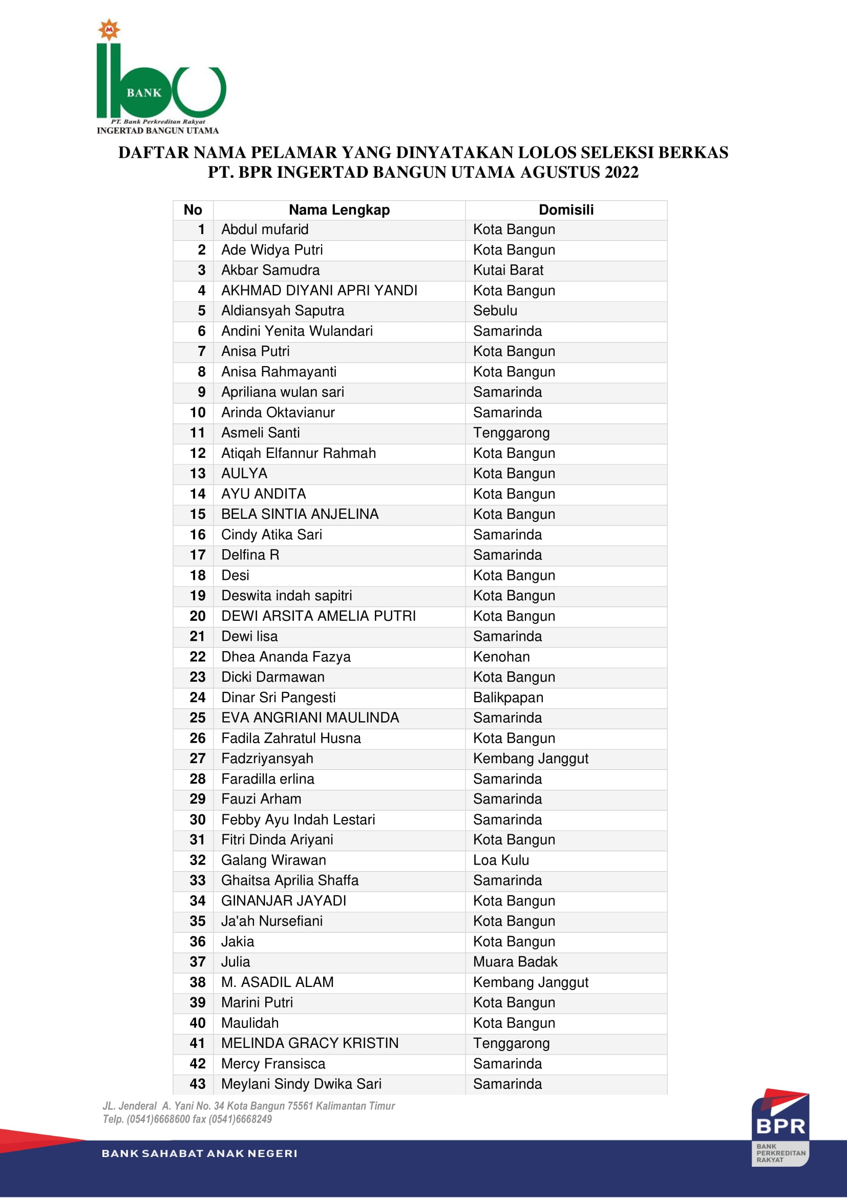 PENGUMUMAN PESERTA LOWONGAN BANK IBU 2022 YANG DI NYATAKAN LOLOS SELEKSI BERKAS (UPDATE)