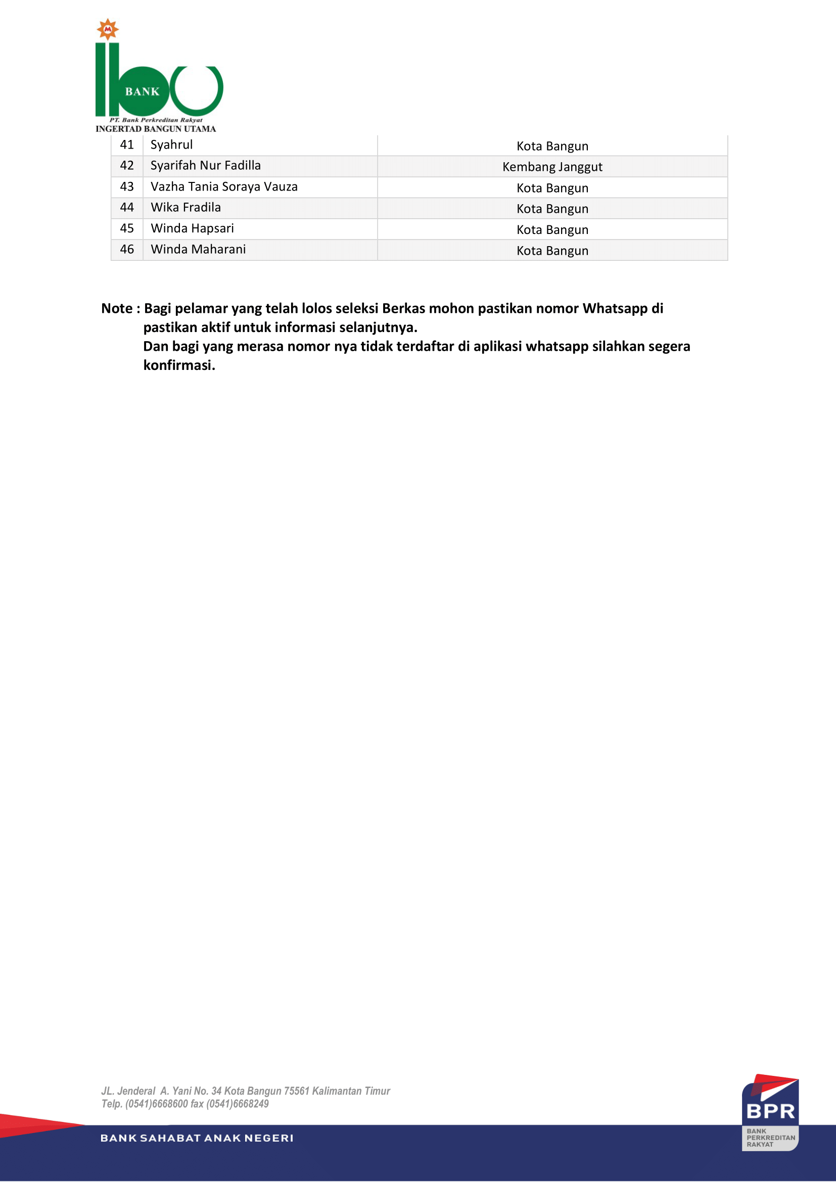 - Pelamar yang lolos seleksi administratif akan di hubungi via Aplikasi Whatsapp di nomor yang telah dinyatakan lolos dan akan di undang di Grup Aplikasi Whatsapp untuk informasi terkait jadwal Tes Tertulis .